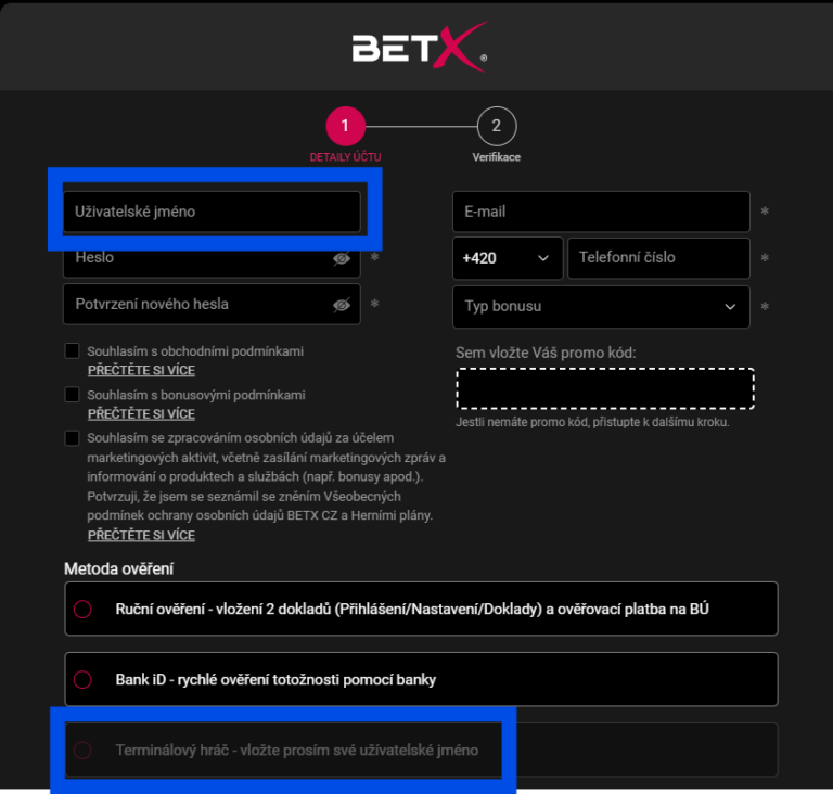 Poté zvol v Metoda ověření volbu Terminálový hráč a postupuj v registraci dále.